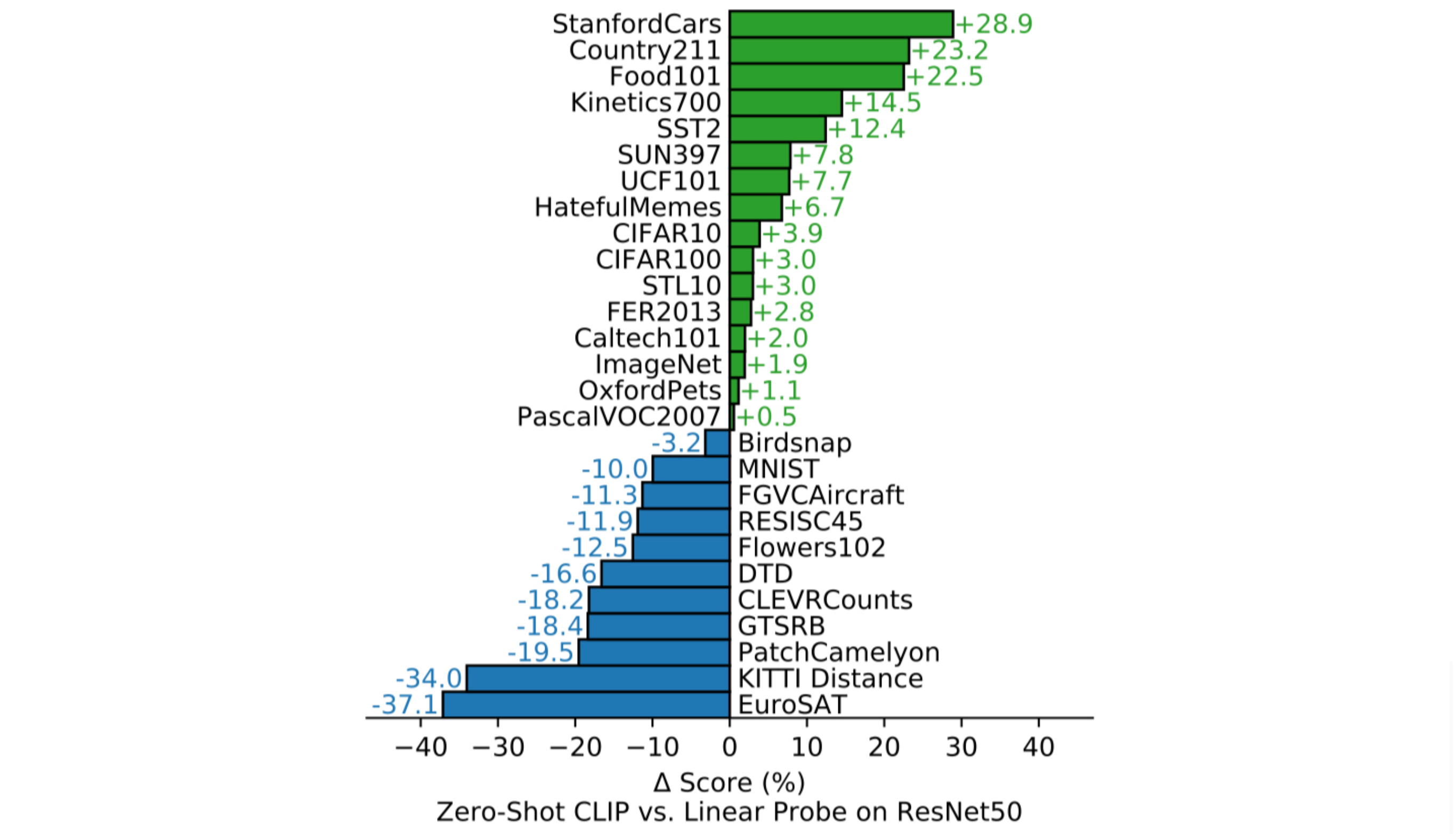 - The putative cause of the difference is the varying amount of per-task supervision between (CLIP’s) WIT and (ResNet50’s) ImageNet.