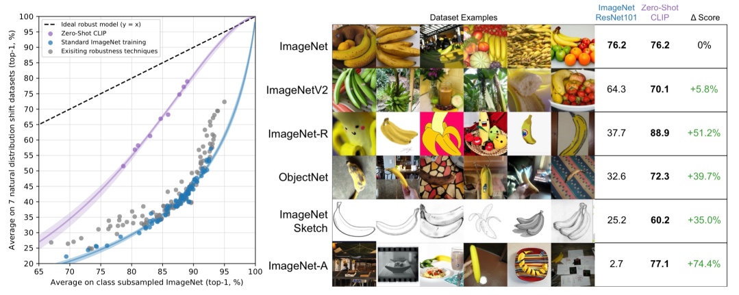 Finally, the authors evaluated the robustness of CLIP under distribution shifts. They did so by comparing Zero-shot CLIP to the models trained on ImageNet dataset, along with those trained with robustness techniques.
