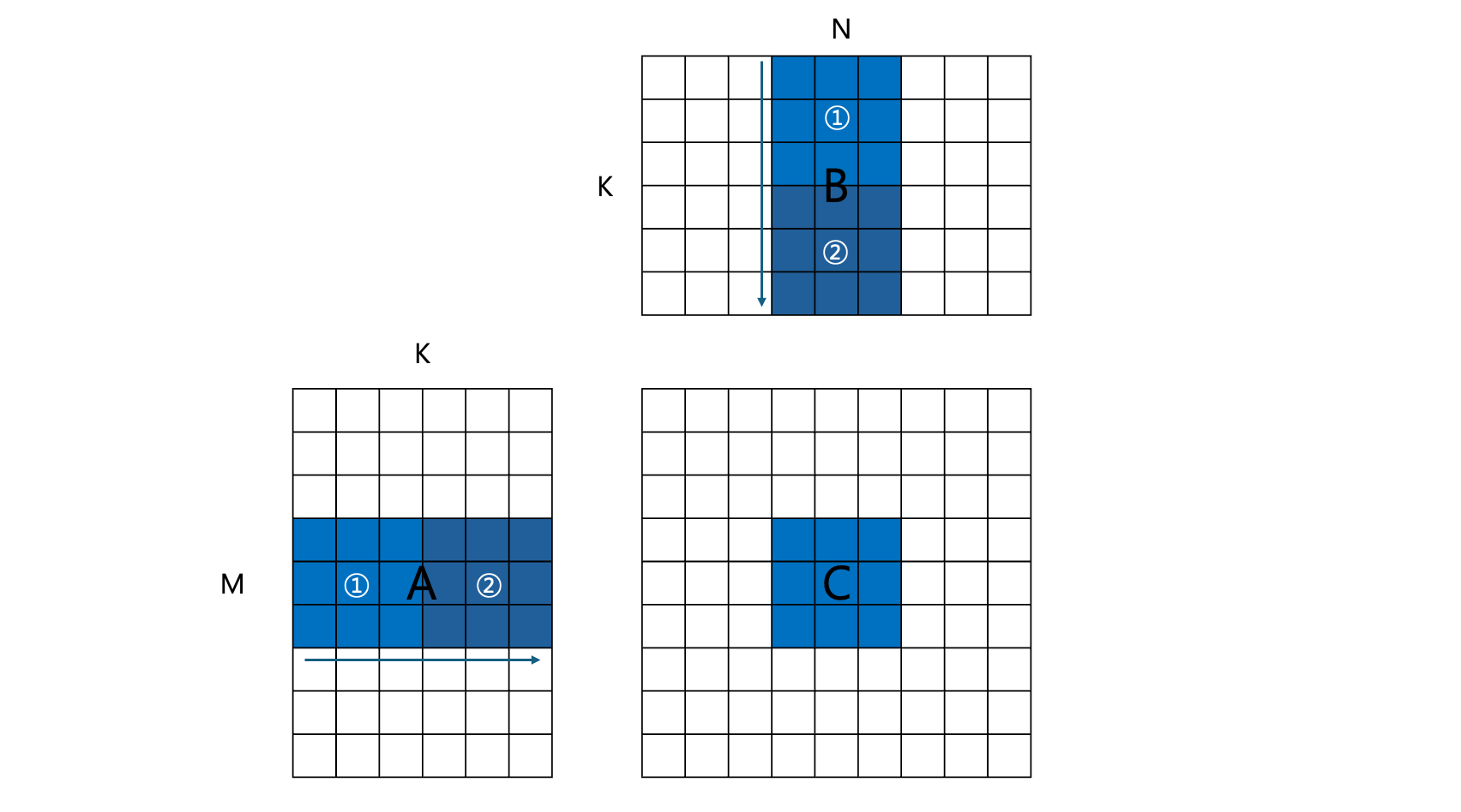 This is the kernel where a basic optimization called tiling is applied. In particular, the number of global memory accesses was significantly reduced by employing shared memory. Since each of the thread blocks processes a single tile of the resultant matrix $C$, this can be dubbed as block tiling. The figure above represents a thread block that computes the $3\times 3$ sub-matrix of $C$, colored in blue.