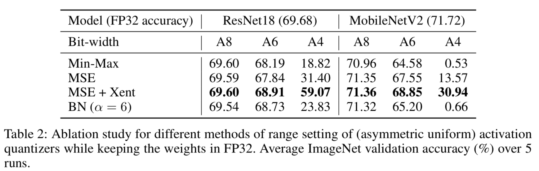 Table 2.를 보면, lower bit로 갈수록 min-max는 성능이 급격하게 떨어지며, MSE가 훨씬 나은 결과를 보여준다. 또한, 마지막 계층에만 Cross Entropy를 사용한 경우(MSE+Xent)가 특히 lower bit에서는 다른 방법에 비해 훨씬 좋은 성능을 보임을 알 수 있다.
