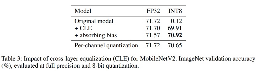또한 Cross Layer Equalization과 bias absorption이 이미 적용되어 있는 상태에서도 bias correction을 추가로 적용할 시 성능이 소폭 상승하는 것 또한 확인할 수 있다.