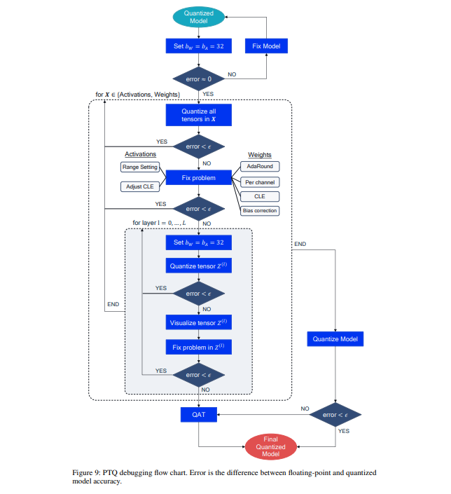 논문에서는 모델을 quantize했음에도 불구하고 성능이 잘 나오지 않는 경우, 이를 해결하기 위해서 어떻게 해야 하는지 debugging step 또한 제시한다. 이는 위의 Figure 9에 요약되어 나타나 있다.