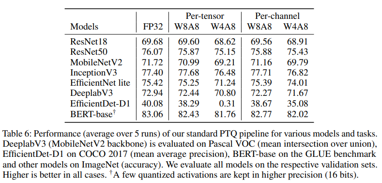 위 Table 10은 4.4에서 제시한 표준적인 QAT 방법론을 적용해 다양한 task에 사용되는 네트워크들을 quantize한 결과물이다. 위의 세 개는 depthwise separable convolution이 없는 것들, 그 아래의 네 개는 있는 것들이며 NLP에 사용되는 BERT-base가 포함되어 있다.
