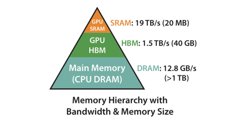 일반적으로 가장 빠르지만 용량이 작은 on-chip SRAM이 있으며, 그 아래 단계로 GPU High Bandwidth Memory(HBM)과 CPU의 메인 메모리가 있는 형태이다. GPU는 계산을 할 때