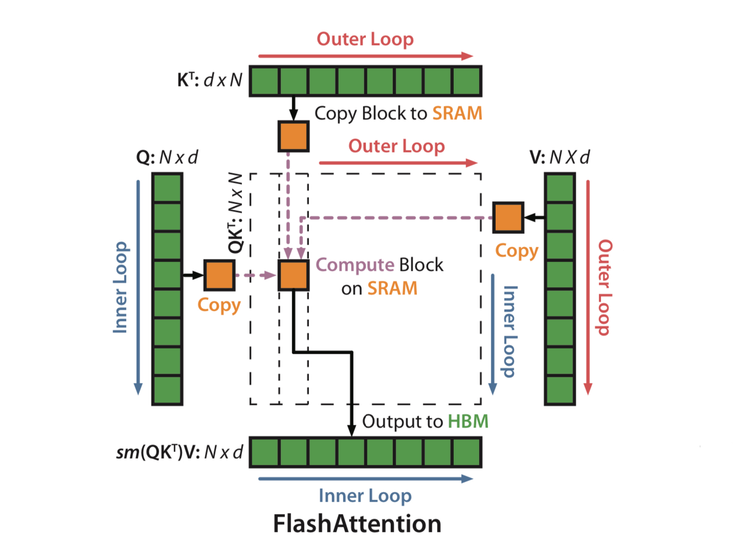 - Tiling: 입력 행렬을 블럭들로 쪼개어, 이를 기본 단위로 하여 incremental하게 계산을 수행한다.