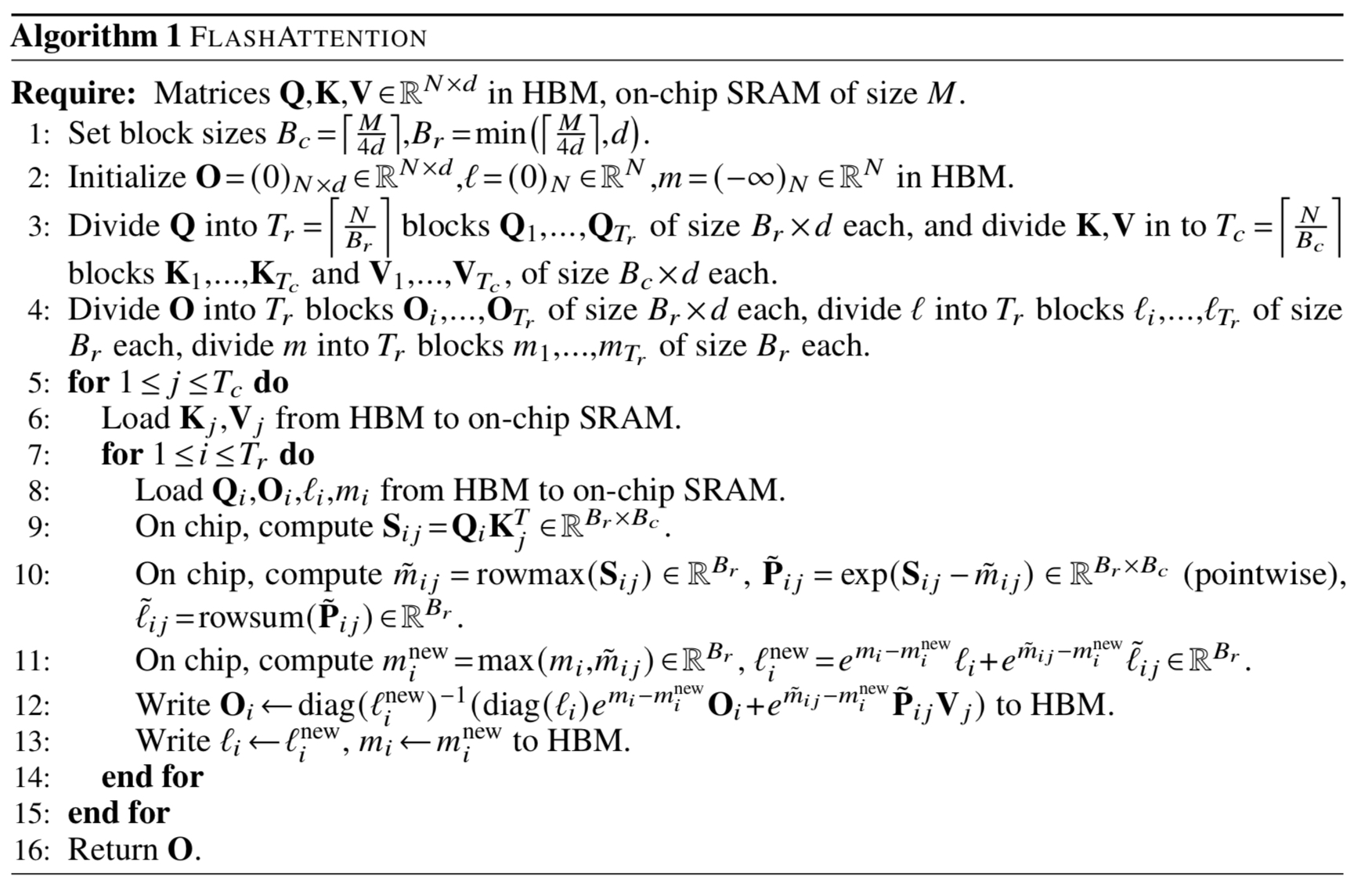 Introduction에서 말했듯, 논문에서는 tiling과 recomputation이라는 두 테크닉을 이용한다. 먼저, $\mathbf{Q}, \mathbf{K}, \mathbf{V}$를 여러 블록으로 쪼개어, HBM에서 이들을 블록 단위로 SRAM에 로드하고 계산하도록 수정한다. 각 블록에서 나온 output에 scaling factor를 곱한 후, 반복문을 돌며 누적해 더하면 최종 결과가 나오게 되는 식이다. 논문에서는 이를 Algorithm 1이라 부른다.