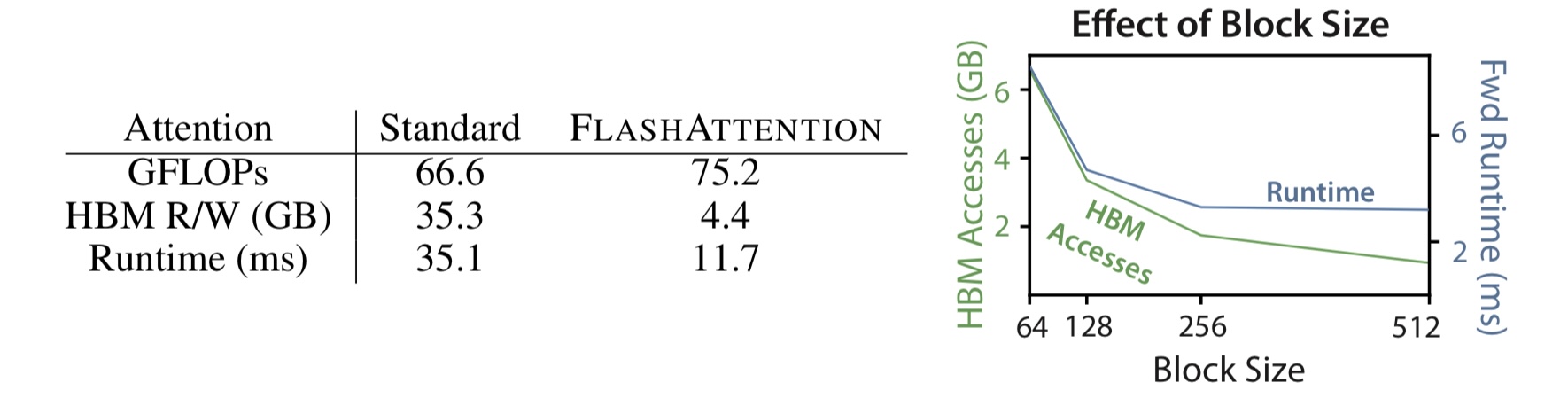 - 오른쪽 그림에서는 Block size $B_c$를 조절해가며 HBM access의 수를 줄였을 때 실제로 실행시간이 감소한 것을 확인할 수 있다.