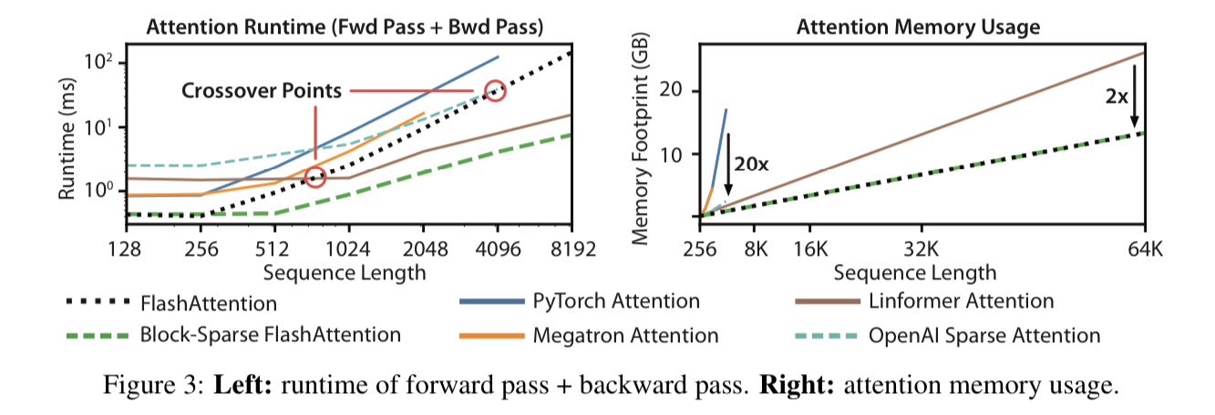 - 왼쪽 그림을 보면, flash attention이 FLOPs 수가 더 많음에도 Standard attention보다 3배 이상 빠른 실행시간을 보여주는 것을 알 수 있다.