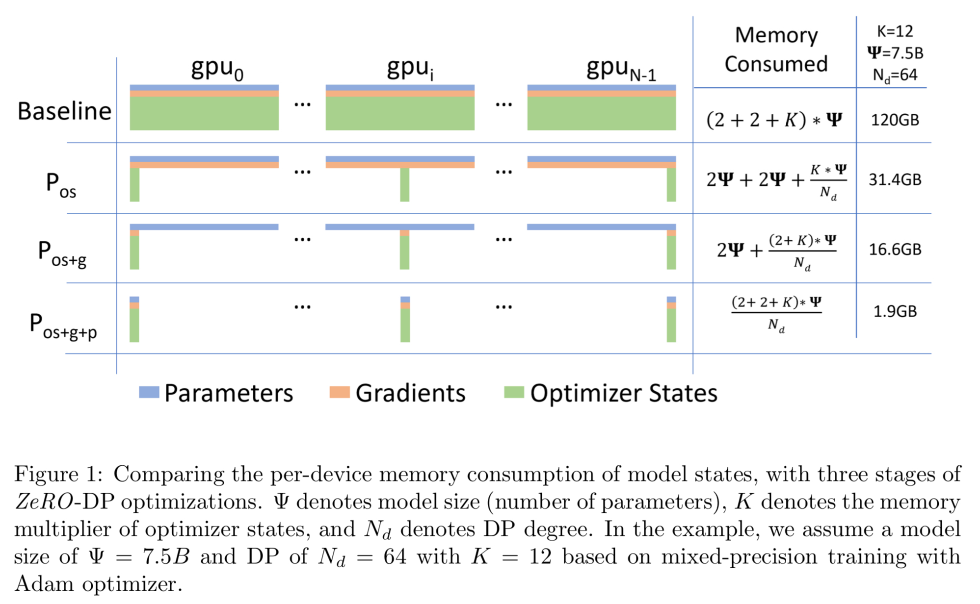 Dubbing the memory multiplier of optimizer as $K$, we draw the conclusion that total of $(2+2+K)\Psi=16\Psi$ bytes of memory is required to train a model with $\Psi$ parameters.