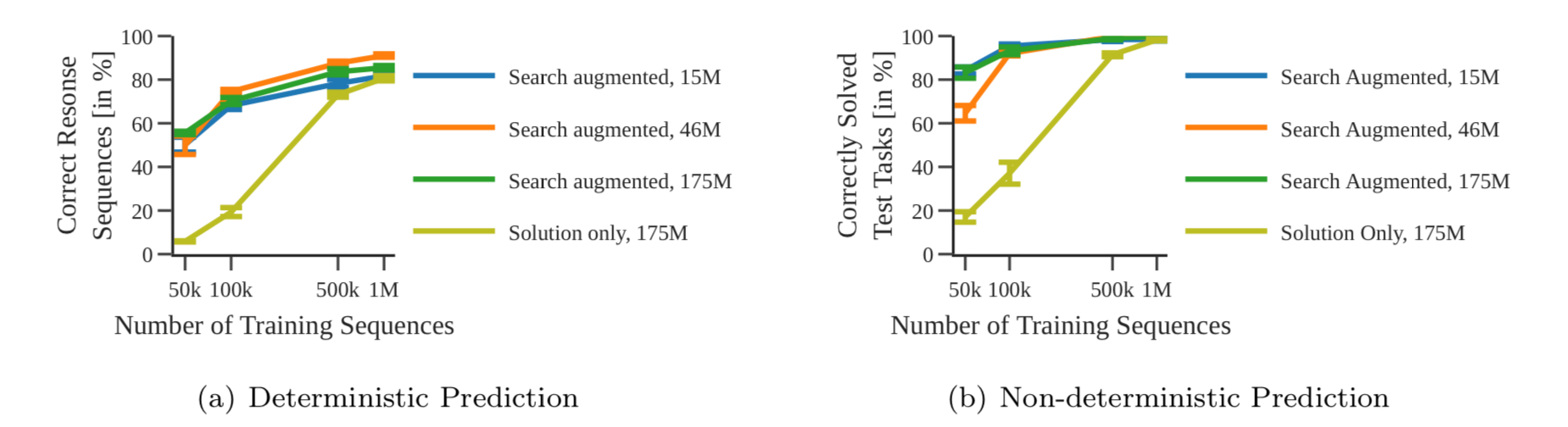 The above figure indicates the portion of correctly solved task for each of the models. As in the both plots, even the smallest search-augmented model outperformed the largest solution-only model. This is a surprising result considering that search-augmented models have output lengths 10+ times larger than solution-only models. Also, the figures indicate that model size impacts the performance only when the dataset is small.
