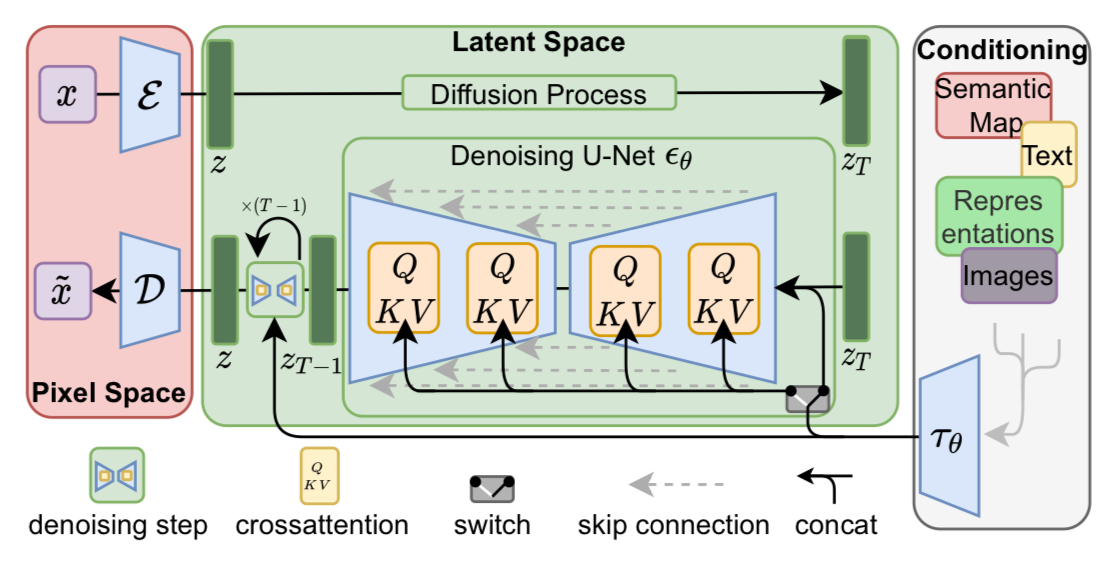 The above figure outlines the overall architecture of the conditional LDM demonstrated in the paper. Here, the crucial part to control the generated image is the conditioning mechanism, which is implemented by cross-attention. The encoder with condition can be denoted as $\mathcal{E}_\theta(z_t, t, y)$ where $y$ is the condition, which can either be text, semantic maps, or other image inputs.