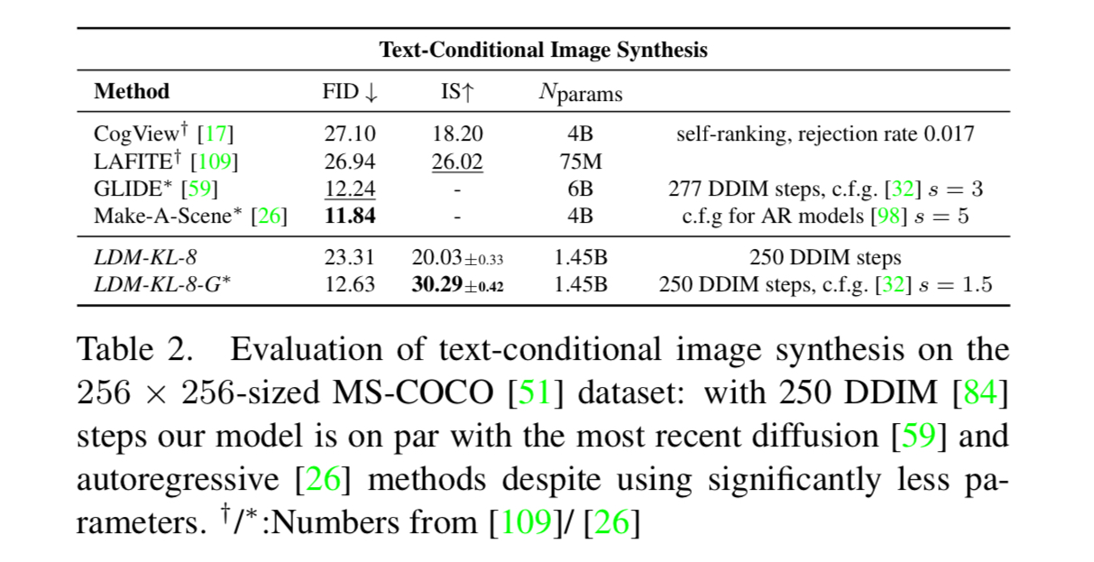 As depicted in the above table, the guided LDM-KL-8-G was on par with the SOTA autoregressive model, whie employing a significantly less number of parameters.