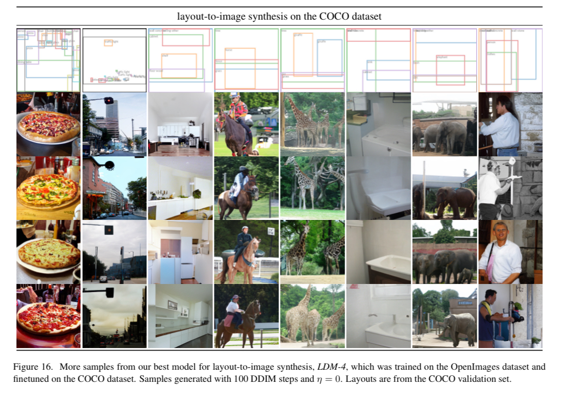 Secondly, the LDM was trained to synthesize images based on semantic layouts on COCO, performing layout-to-image synthesis. Below are the samples of generated images.