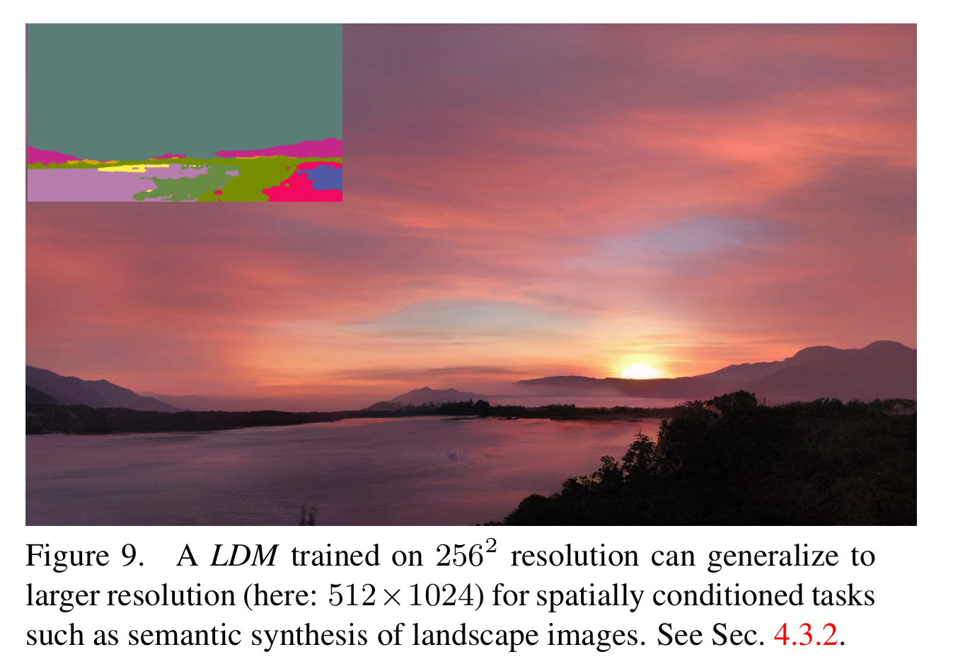 While experimenting for semantic synthesis, the authors discovered that the model generalizes well to a larger dimension. This is enabled by the convolution-based structure of the denoising UNet, which is insensitive to the input dimension, although it was trained on $256^2$. This feature was further applied to the super resolution and inpainting task, which are discussed in the continuing sections.