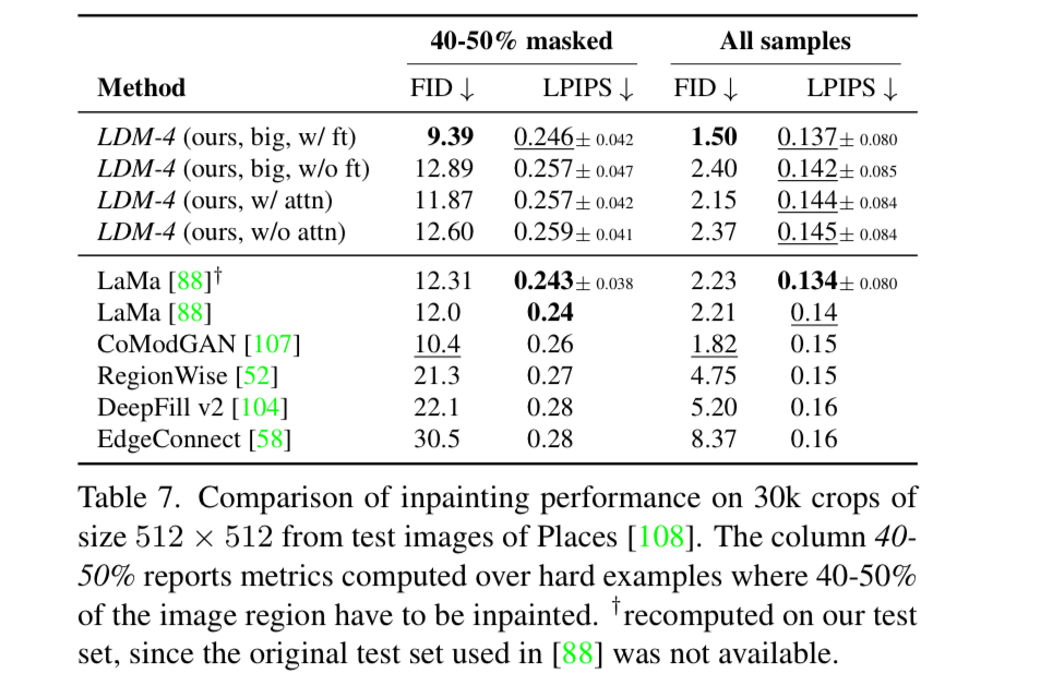 Inpainting is a task where the model is trained to fill the masked region of the image. The authors have compared the LDM’s performance on the task with the SOTA approaches.