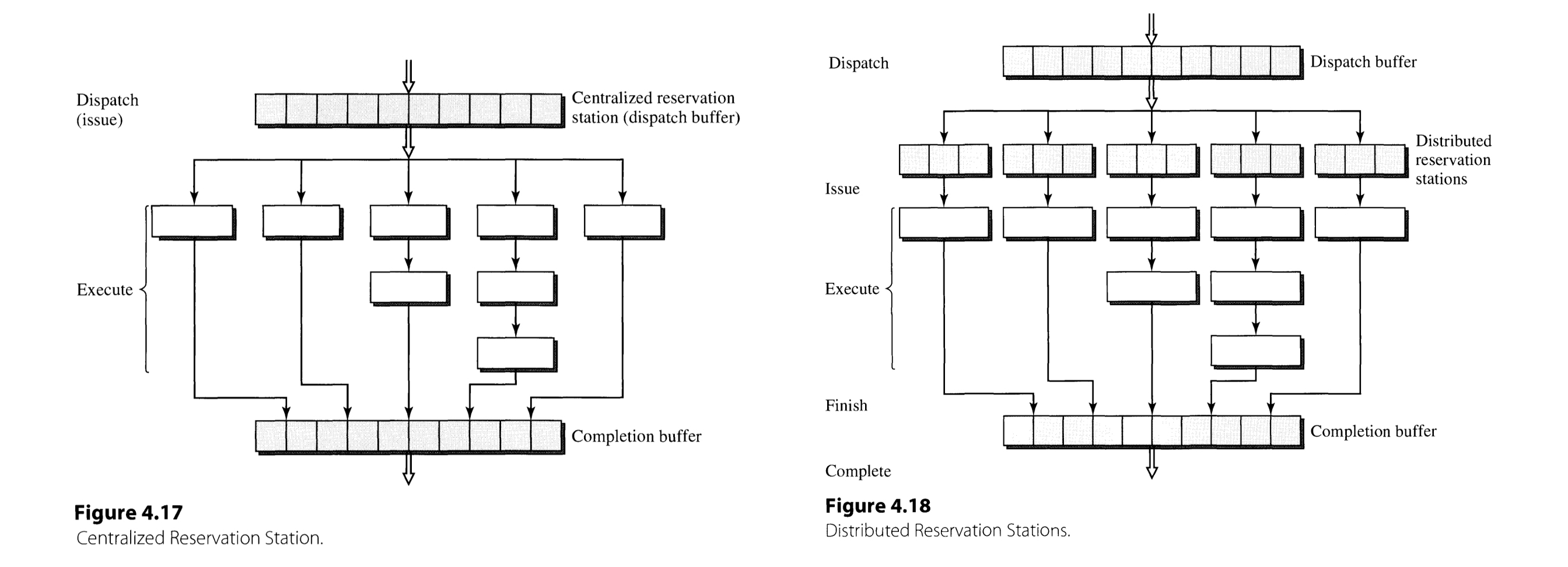 Reservation stations can be implemented either in centralized and distributed manner (Figure 4.17 and 18). The difference between the two types of implementation is whether there is a single, centralized reservation station, or each functional unit possesses its own reservation station.