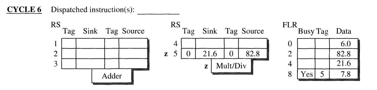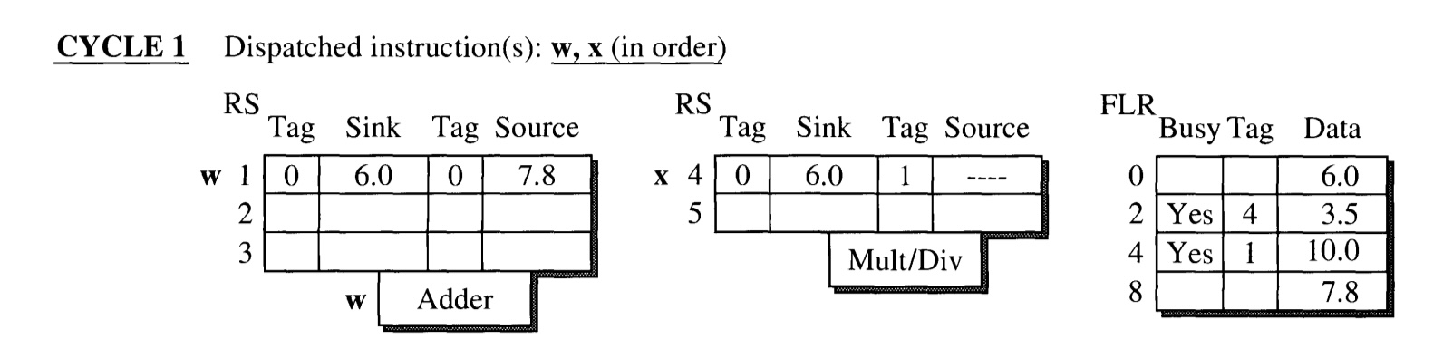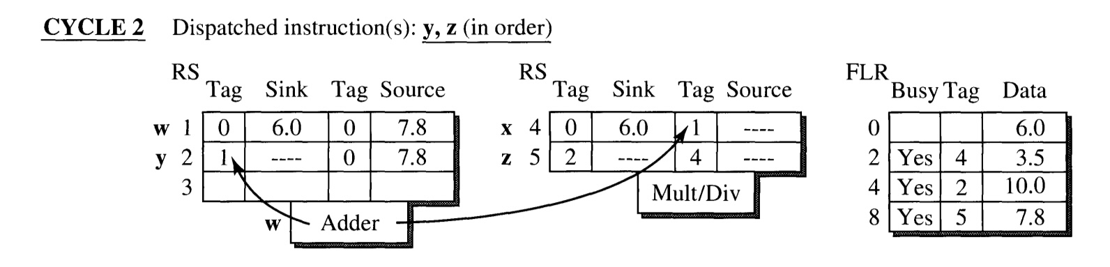 - The execution of instruction w(which has tag 1) is finished at the end of the cycle. Its result is broadcasted through CDB.
