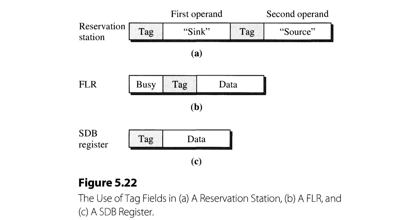 Figure 5.22 illustrates how the (register) tags are employed in reservation station, FLR, and SDB. When FLOS (Floating point operand stack) dispatches an instruction, it inspects if its operands are available or not. If an operand is available in FLR, the content of the register is directly copied to the reservation station. Otherwise, i. e. the operand is unavailable, being processed by the prior instructions, a tag corresponding to the operand is copied instead.