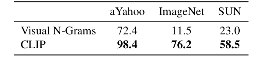 As the above table indicates, CLIP outperformed Visual N-Grams with a great margin, achieving performance on par with fully supervised models. Note that the comparison was held for models that can be trained within a GPU day.