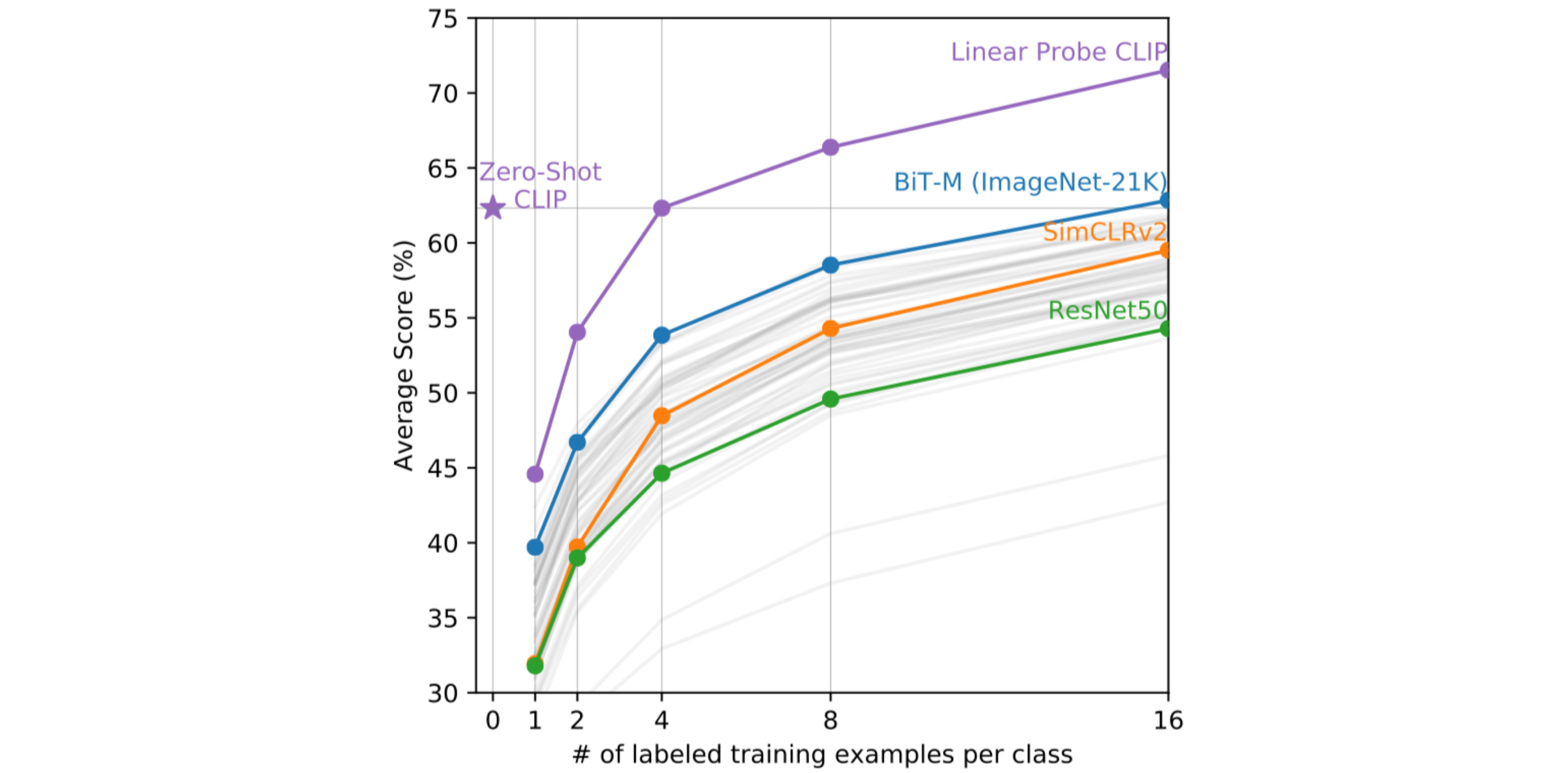 The above plot shows that zero-shot CLIP matches the performance of a 4-shot CLIP with linear probing, although one might expect even a one-shot model may outperform zero-shot CLIP. This is because while CLIP can directly specify visual concept through natural language, few-shot learners have to learn this indirectly through examples. This context-less example-based learning is prone to spurious correlations, especially in one-shot case.