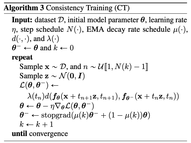 $$\mathcal{L}_{CT}^N(\theta, \theta^-)=\mathbb{E}[\lambda(t_n)d(\mathbf{f_\theta}(\mathbf{x}+t_{n+1}\mathbf{z}), \mathbf{f_{\theta^-}}(\mathbf{x}+t_n\mathbf{z}, t_n))]$$