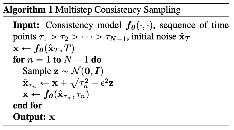 Now, we have everything needed to generate a new data. Given a well-trained consistency model, the process of sampling a new data from data distribution can be summarized by the following pseudocode.