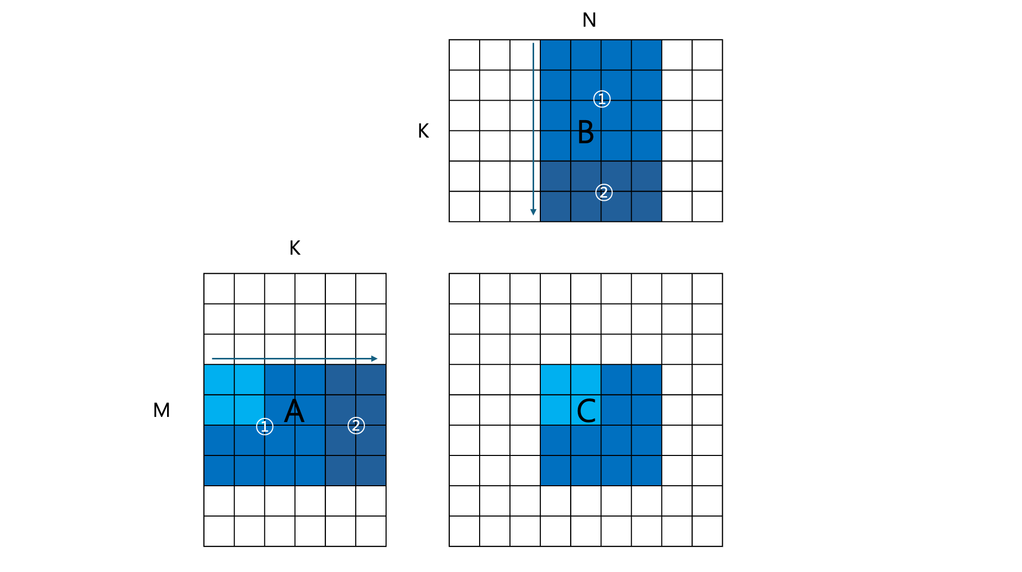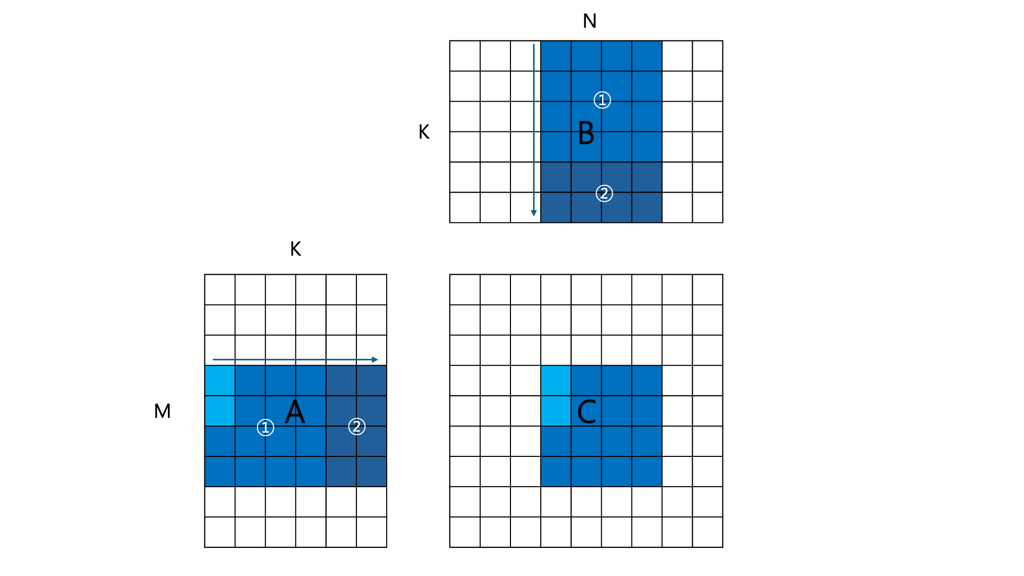 This is the kernel where a basic optimization called tiling is applied. In particular, the number of global memory accesses was significantly reduced by employing shared memory. Since each of the thread blocks processes a single tile of the resultant matrix $C$, this can be dubbed as block tiling. The figure above represents a thread block that computes the $3\times 3$ sub-matrix of $C$, colored in blue.