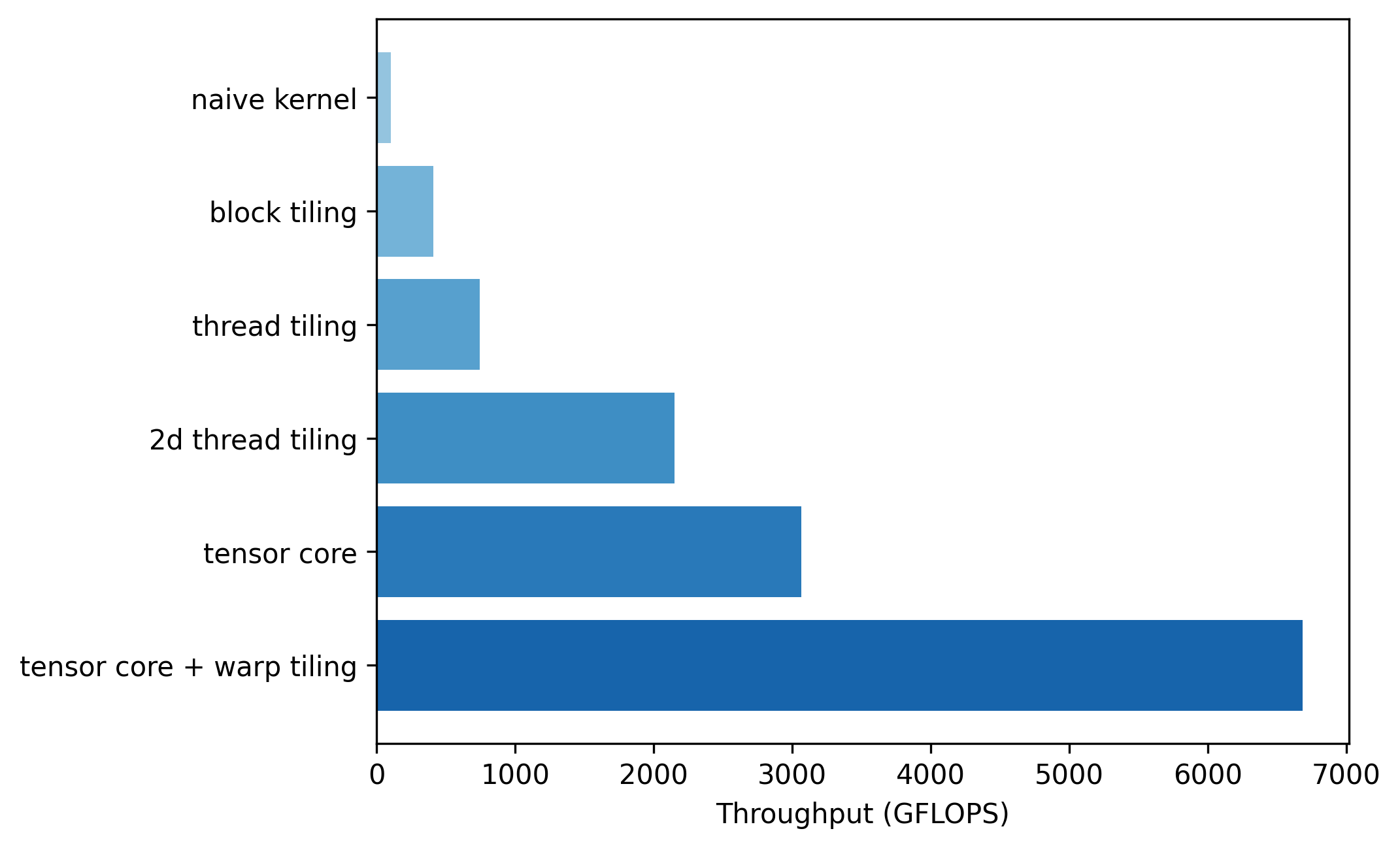 Therefore, applying 2D tiling similar to what was used in kernel 3 can increase the workload per warp, thereby effectively reducing the non-computational overhead. With this applied, each thread block computes a larger sub-matrix than the previous $16\times 16$. In the code, this was achieved by defining an array of wmma::fragment's and performing multiple computations per single load. Applying this optimization resulted in a final throughput increased to 6688 GFLOPS.
