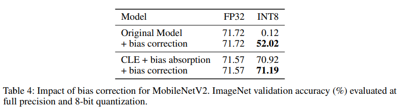 Table 4는 MobileNetV2에 bias correction이 적용되기 전과 후의 성능 변화를 비교해 보여준다. INT8로 quantize시, bias correction 없이는 random에 가깝던 output이 52.02%의 정확도까지 올라간 것을 알 수 있다.