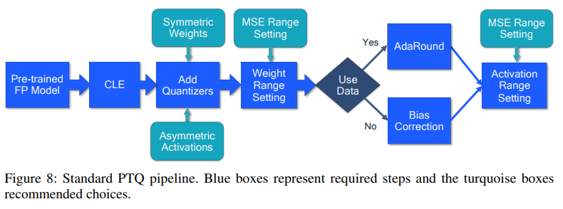 앞에서 살펴본 실험들에 근거해, 논문에서는 Post-Training Quantization을 위한 표준적인 pipeline으로 위의 그림과 같은 방법을 제시한다.