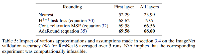 위 Table 5를 보면, 4-bit로 quantize하였을 때 rounding-to-nearest보다 AdaRound를 사용하였을 때 성능에 획기적인 향상이 있는 것을 알 수 있다. 특히, hessian을 이용한 최적화 방정식이나 각 output의 quantization error의 MSE를 최소화하는 것보다도 오히려 그 근사 방법인