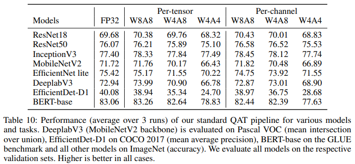 위 Table 10은 4.4에서 제시한 표준적인 QAT 방법론을 적용해 다양한 task에 사용되는 네트워크들을 quantize한 결과물이다. 위의 세 개는 depthwise separable convolution이 없는 것들, 그 아래의 네 개는 있는 것들이며 NLP에 사용되는 BERT-base가 포함되어 있다.