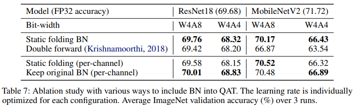 위 Table 7을 보면, per-tensor quantization의 경우에 앞서 설명한대로 double forward 방법이 static folding에 비해 성능이 오히려 좋지 않은 것이 확인된다. 반면 per-channel quantization의 경우 static folding을 하는 것보다도 설명한대로 BN을 그냥 두고 inference time에만 quantizer에 합치는 방법이 대체로 더 효과적인 것을 알 수 있다.