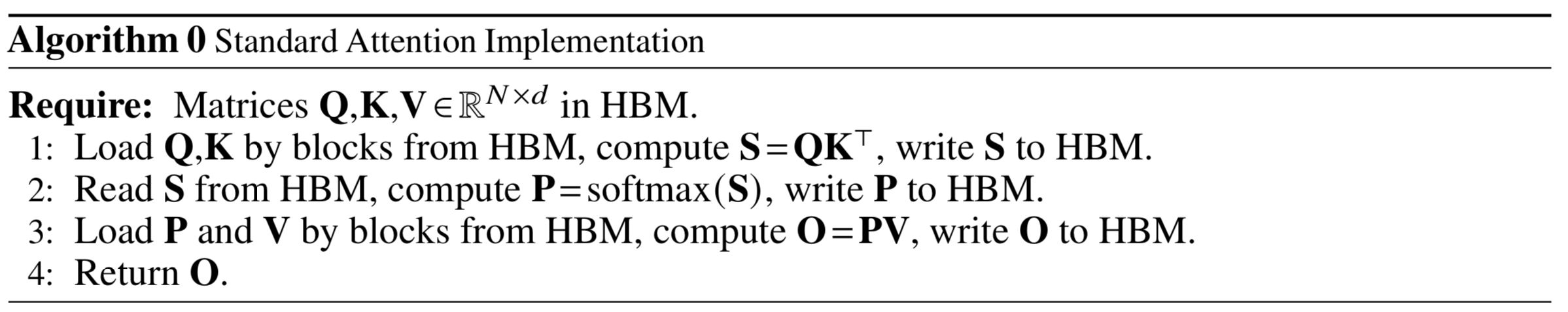 Attention의 표준적인 구현에서는 intermediate matrix들인 $\mathbf{S}$와 $\mathbf{P}$를 HBM에 저장한 후 사용하기 때문에 $O(N^2)$의 공간복잡도를 가지게 된다(일반적으로 $N\gg d$).