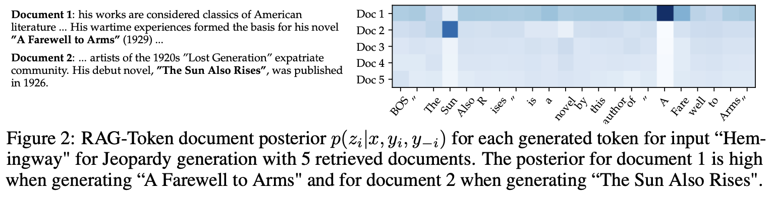 Above is the plot of posterior $p(z_i|x, y_j)$ when the model generates the title of a book "A Farewell to Arms." High value of posterior indicates that the model depended heavily on the document during the generation. The figure indicates that RAG depends on the non-parametric knowledge only at the beginning of the sentence, while the consecutive tokens were generated based on the generator's own abilty of language modelling. Thus, the role of non-parametric knowledge can be considered as to elicit the knowledge that is already existent in the parametric memory.