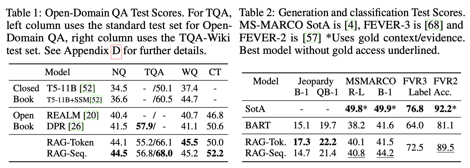 The paper suggests two formulations of RAG: (1) one that references a single document in the entire generation process, and (2) the other that uses different documents in the per-token basis. As a result of the fine-tuning using these two models, the authors have achieved the SOTA or near-SOTA performances from several knowledge-intensive NLP benchmarks.