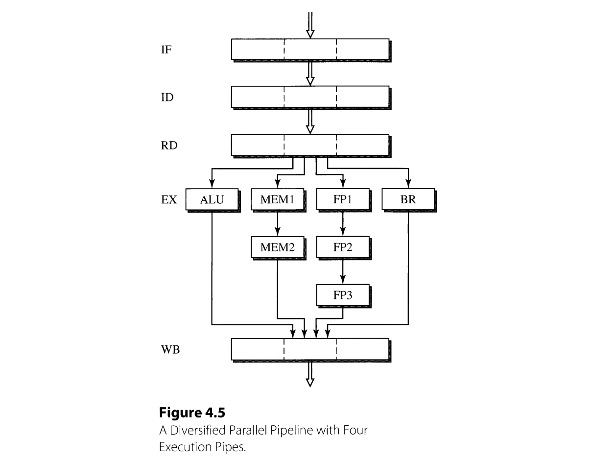 These limitations can be overcame by the techniques used in superscalar processors. To begin with, we can achieve IPC greater than 1 by initiating the execution of more than one insturctions in a cycle, by employing parallel pipelines. In such parallel machines, each pipeline consists of different functional units, which can be customized to process different kinds of instructions. For example, the pipeline in the figure below (Figure 4.5) has four functional units each in charge of integer ALU, memory, floating-point arithmetic, and branch operations. This case, all the instructions experience only necessary latency. Also, if the dependency between the instructions is resolved in prior, the instructions do not go through further stalling.