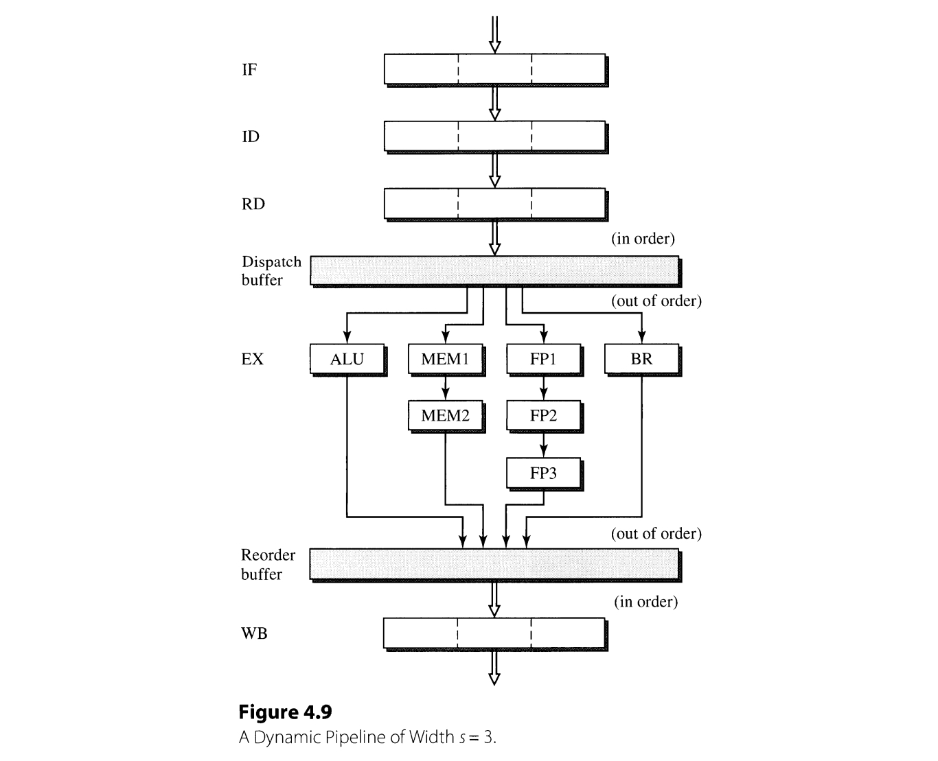 Superscalar processors use these complex buffers as dispatch buffer, which stores instructions to be executed. This makes the out-of-order issuing (i. e., begin the execution) possible, allowing a trailing instruction to get over the prior stalled instruction. However, the instructions must finish in order to guarantee the proper handling of exceptions. Therefore, another multientry buffer called the completion buffer must be employed to reorder the instructions that have finished the execution. These pipelines that support out-or-order execution are called dynamic pipelines.