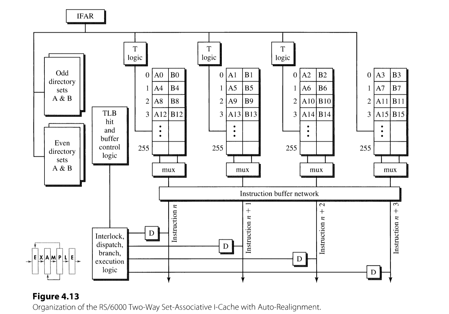 Hardware solutions, in contrast, works at run time. The solution is implemented by employing an additional alignment hardware. One of the examples is that included in IBM RS/6000 machine. the I-cache of RS/6000 is a two-way, four-set cache where four subarrays are in charge of storing instructions in address $4k, 4k+1, 4k+2$, and $4k+3$, respectively. Once the fetch logic detects that the starting address of the fetch group is not divided by 4, what is denoted as “T-logic” automatically increases the row number of subgroups. For example, if the starting address takes the form of $4k+2$, the subgroup 0 and 1 will be fetching $4(k+1)$ and $4(k+1) + 1$, instead of $4k$ and $4k + 1$. The fetched instructions are further rotated by the instruction buffer network. As a result, the device can always fetch four consecutive instructions from an arbitrary address.