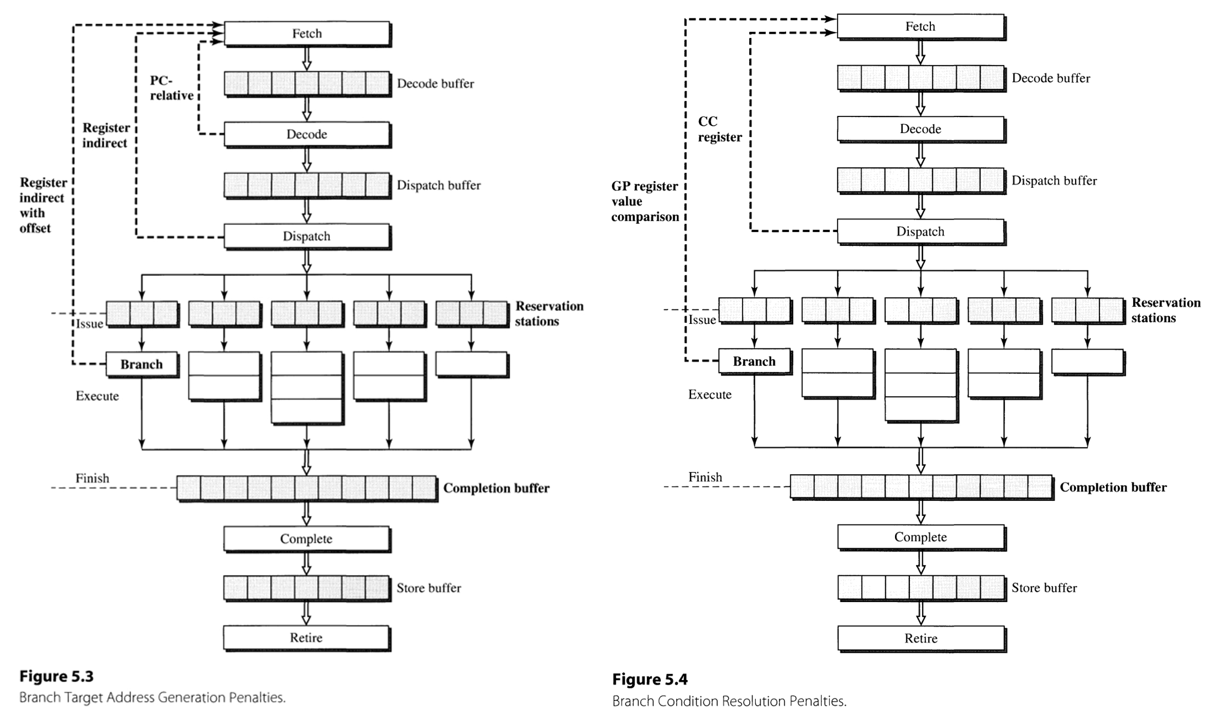 Also, condition resolution using condition codes is finished at the dispatch stage, whereas that using general-purpose registers is finished at branch functional unit. The number of stalled cycles is determined as the maximum of stalls that is required by the target address generation and condition resolution.