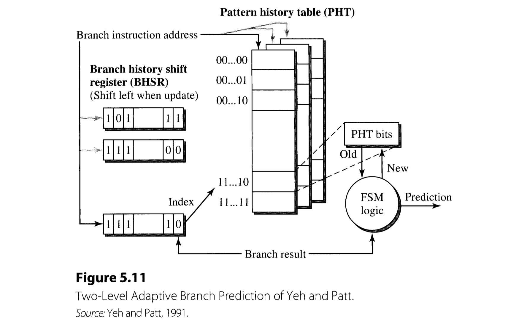 The Yeh-Pratt branch prediction algorithm employs two kinds of memory devices: branch history shift register(BHSR) and pattern history table(PHT). BHSR records the history of the recent $k$ branch results, which is used for indexing within the PHT. The resulting PHT entry encodes the state of branch prediction FSM.
