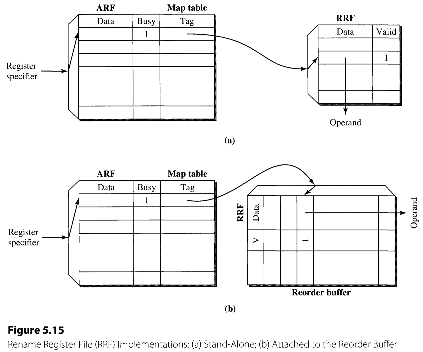 Figure 5.15 delineates the two common ways to implement the RRF. As in the figure, RRF can be implemented either (a) as a separate hardware or (b) attached to the reorder buffer. This chapter focuses on the design (a) to proceed to the details.