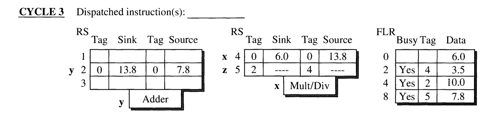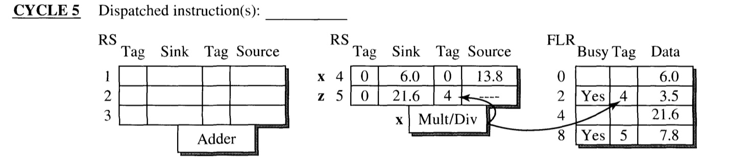 - The execution of instruction w(which has tag 1) is finished at the end of the cycle. Its result is broadcasted through CDB.