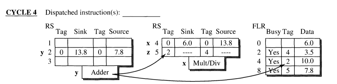 - Sink of RS entry 5(z) and FLR entry R4 has the matching tag (2), and hence receives the result.