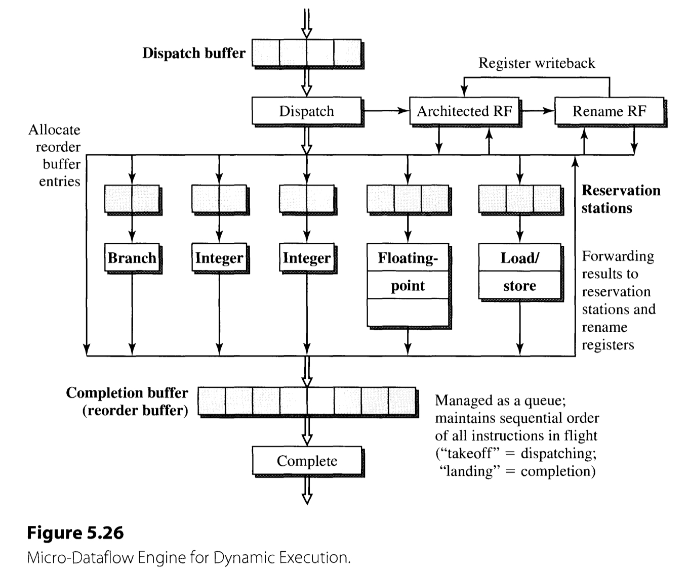 are buffered. The buffer stores the status(waiting, executing, or finished) of each instruction, along with additional bits such as if the instruction is speculative or not. Only finished and nonspeculative instruction are completed. The implementation of the buffer is held as a circular queue, using an head and tail pointers.
