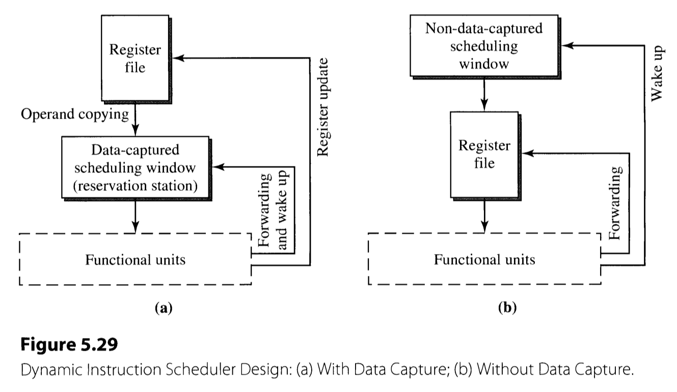 The former style of scheduler(Figure 5.29(a)) copies the instruction’s operands when dispatching. If they are not ready, the register tags are copied instead. When the functional unit finishes the execution, the result must be forwarded to the reservation station, as well as the original register file. This is the scheme used in the Tomasulo’s algorithm.